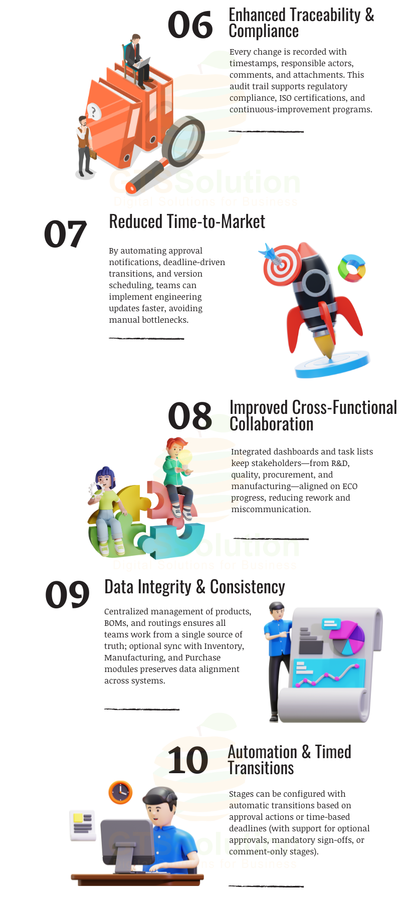 - Independent PLM work centers allow ECO-driven routing even if core MRP modules are disabled.